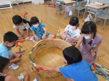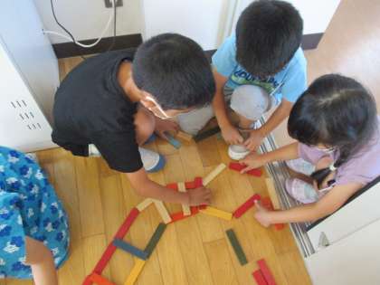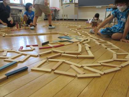 「どこまで伸びるかな。」「そうだ!くっつけてみよう。」など、子供たちはカプラ(積み木)を並べているうちに、ますます想像が膨らみます。初めは、それぞれが作っていた作品を、最後には全てつなぎ合わせ、大きな町のような作品になりました。