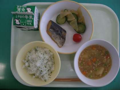 今日は、給食献立では定番の「華風和え」が出ており、子供たちにも人気のメニューです。家庭でよく作られる中華サラダと似ていますが、「華風和え」は和えだれに、ぴりっと風味豊かな一味唐辛子がポイントの味付けがされています。野菜がたっぷりの「華風和え」を味わっていただきましょう。