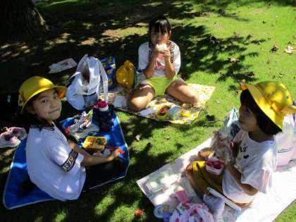 お弁当は環水公園で食べます。気持ちのよい天気の中、家の方が心を込めて作ってくださったおいしいお弁当を、楽しく味わいながら食べています。保護者の方々、お弁当の準備をありがとうございました。
