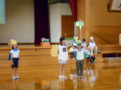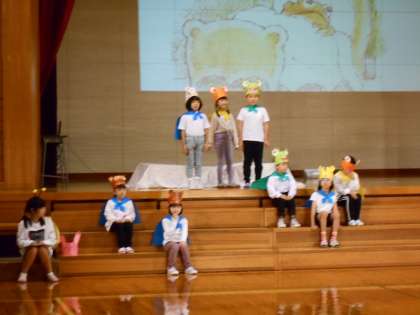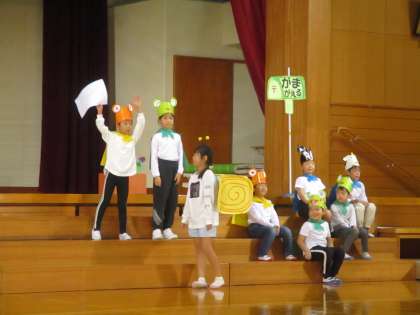 10月29日(土) 1・2年 「お手紙〜古沢っ子バージョン〜」 その2 公開日 2022/10/29 更新日 2022/10/29 最新の出来事 子供たちは、がまくんやかえるくんになりきって、台詞の速さや声の大きさ、動きを工夫して演じました。今日は、これまで以上に、子供たちが演じる登場人物の気持ちが伝わってきました。ナレーター役の子供も身振り手振りを工夫して、発表を盛り上げました。