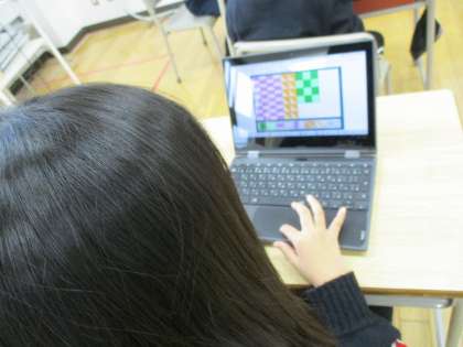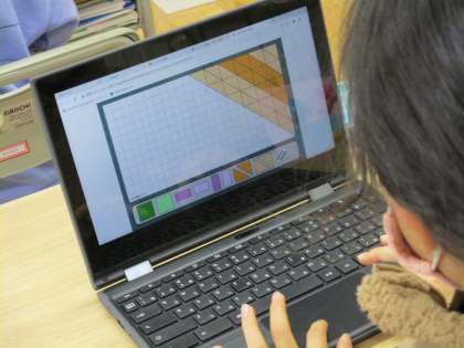 最近の算数の時間は、九九を頑張っています。今日は、久しぶりに図形の復習として、デジタル教材を使った模様作りに挑戦しました。正方形や長方形、直角三角形をすきまなく並べると、新たな図形が見えたり、きれいな模様になったりしました。最後は、できた模様を見せ合い、楽しみながら学ぶことができました。