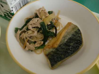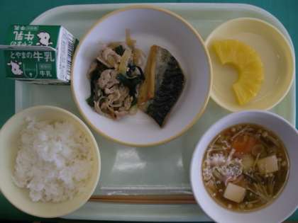 今日は基本的な和食、一汁二菜の献立です。主菜の「鯖」、副菜の「しらたきのピリ辛炒め」、汁物は「白玉汁」です。「鯖」は、秋から冬にかけて脂がのっていて、おいしい季節になります。「鯖」の脂は、脳や、さらさらの血液をつくる基となり、日常的に食べることで、生活習慣病を防ぐ食材の一つとして注目されています。「鯖の塩焼き」は和食としてだけでなく、海外でも魚を塩焼きにして食べる地域もあるそうです。栄養価が高い「鯖」をおいしくいただきましょう。