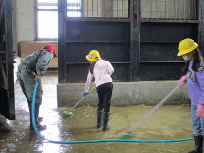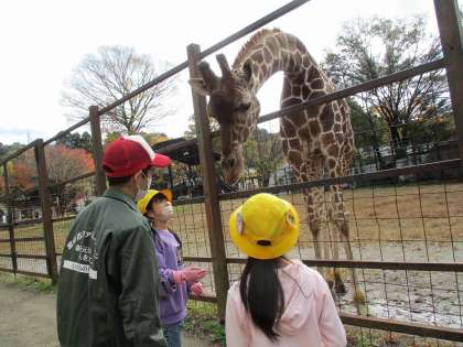 キリングループは、部屋の掃き掃除の後、水を掛け流しながらブラシでこすり、ぴかぴかの部屋に仕上げました。また、キリンを間近で観察したり、餌をあげたりするなど、貴重な体験をすることができ、子供たちはとても嬉しそうでした。