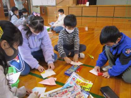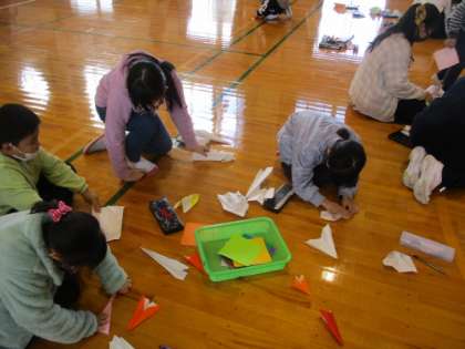 紙飛行機作りでは、班の仲間と紙飛行機を作り飛ばしました。遠くまで飛ぶ紙飛行機を事前に研究して、今日の集会に臨んだ子供たちもいました!