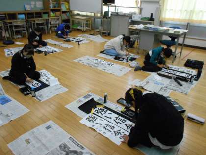 5年生は「雪の大地」、6年生は「強い信念」という文字を書きます。子供たちは、手本を見ながら、とめ、はらい等に気を付けて、集中して練習に取り組んでいます。