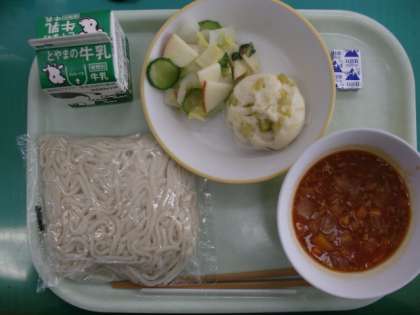 今日は子供たちに大人気のソフト麺が出ています。温かいミートソースに麺を絡めていただきます。サツマイモ入りの蒸しパンも甘くておいしく、お腹が満たされます。さっぱりとしたシャキシャキの「白菜とりんごのサラダ」も冷たくて、お腹のバランスを整えてくれますね。