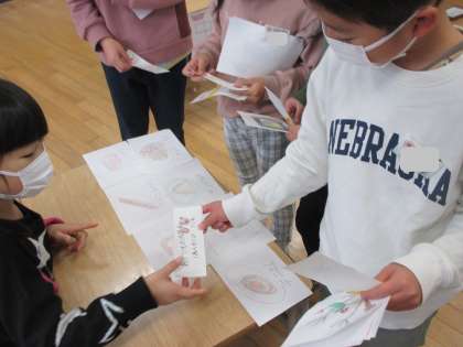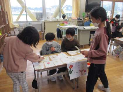 国語科では「ものの名まえ」を学習しています。今日は、いろいろな物の名前を集めて、お店屋さんを開きました。お客さんは、校長先生や保健の先生、そして2年生の皆さんです。それぞれのお店では、自分のお気に入りの物をすすめたり、「いらっしゃいませ!」と元気な声でお客さんを招いたりするなど、子供たちは生き生きと活動していました。自分たちの周りに溢れている、たくさんの言葉の面白さを感じることができた時間になりました。