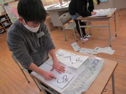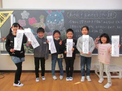 1月10日(火) 2年 書初大会 公開日 2023/01/10 更新日 2023/01/10 2年 3学期が始まりました。2年生は、冬休みの楽しかった思い出や頑張ったことをたくさん話し合いました。 始業式の後は、書初大会を行いました。2学期や冬休み中の練習の成果を十分に発揮し、みんなとてもすばらしい作品に仕上げることができました。