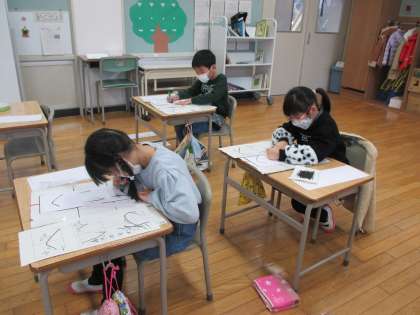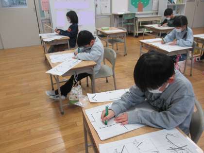 初めての書初大会です。みんな朝からドキドキしていました。「お母さんに見てもらったよ!」「100枚練習したよ!」と、子供たちは冬休み中の頑張りを報告し合っていました。一文字一文字、気持ちを込めて書く子供たちの姿は頼もしく、冬休みの頑張りの成果がどの作品にも現れていました。