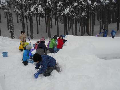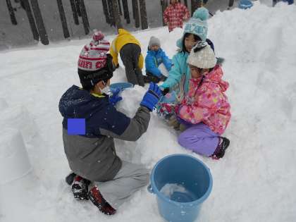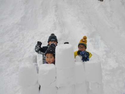 午後の活動は、雪像や雪だるま作りをしました。ふかふかの雪をたっぷりバケツに詰めて型を取ったブロックを作り、仲間と協力して一つ一つのブロックを積み重ねたり、大きな雪だるまを作ったりしながら、思い思いの作品を作りました。子どもの村で体験した活動は、とても楽しい思い出になりました!