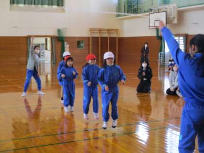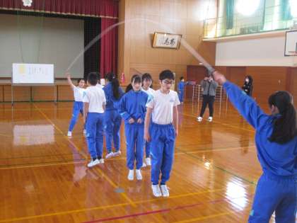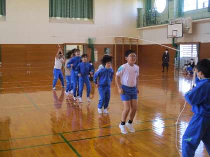 2月22日(水) なわとび大会 その2 公開日 2023/02/22 更新日 2023/02/22 最新の出来事 長縄跳びの部では、学年ごとに全員で跳ぶ回数の目標をもって取り組みました。どの学年も気合が入り、これまで以上に回数を伸ばした学年がたくさんありました。また、他の学年の跳ぶタイミングに合わせて「ハイッハイッ」と声をかけたり、「もう少し!」「息を合わせて!」など、互いに応援したりする姿が見られました。みんなか自分の力を出し切り、充実した笑顔が印象的でした。