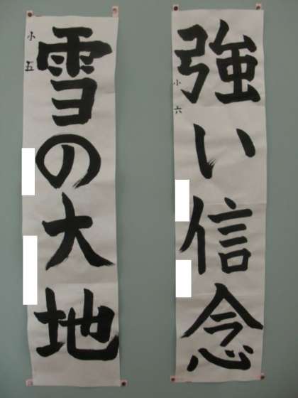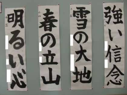去る2月23日(木)、富山市総合体育館にて、第64回富山県小・中・高校生書初め大会がありました。本校からは、3年生以上の4名が参加しました。3年ぶりの開催ということで、久しぶりに県内各郡市から選ばれた児童生徒約2千人が参加し、厳粛な雰囲気の中で力強く筆を走らせました。