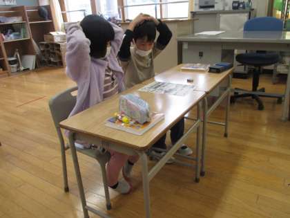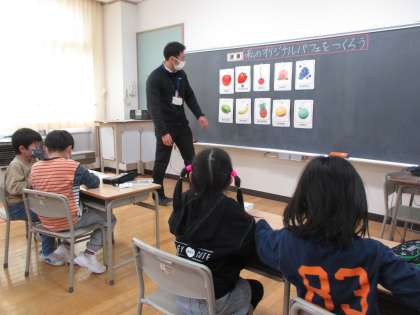 英語専科の先生に英語の授業をしていただきました。英語での挨拶の仕方や簡単な受け応え、果物の名前等、一緒に英語を楽しみました。また、教わった果物の名前を楽しく発音しながら、自分だけのオリジナルフルーツパフェを作るために、交代で果物屋さんやお客さんになって買い物ごっこを楽しみました。お気に入りの果物を選び、自分だけの特別なパフェを完成させた子供たちは、「英語って楽しいね!」と、英語の面白さに触れることができました。