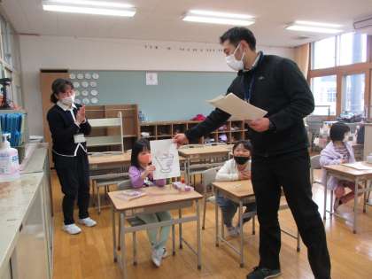 英語専科の先生に英語の授業をしていただきました。英語での挨拶の仕方や簡単な受け応え、果物の名前等、一緒に英語を楽しみました。また、教わった果物の名前を楽しく発音しながら、自分だけのオリジナルフルーツパフェを作るために、交代で果物屋さんやお客さんになって買い物ごっこを楽しみました。お気に入りの果物を選び、自分だけの特別なパフェを完成させた子供たちは、「英語って楽しいね!」と、英語の面白さに触れることができました。