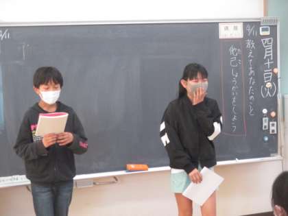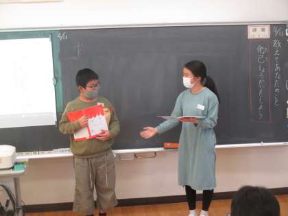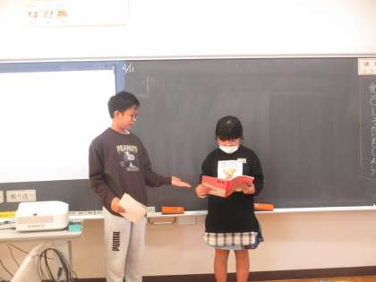 5・6年生は国語科の言葉の準備運動の学習を合同で行いました。6年生で学習する「つないで、つないで、一つのお話」では、2つのグループに分かれて話をつないでいきました。5年生で学習する「教えてあなたのこと」では、5年生と6年生がペアになり、インタビューをした後に、他己紹介をしました。互いのことや友達のことをもっと理解し合えるよい学習になりました。