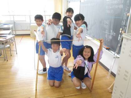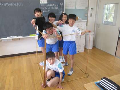 5年生は算数科で立方体の学習をしています。今日は1メートルものさしを使って、1立方メートルの立方体を作る学習をしました。みんなで協力してきれいな立方体を作ることができました!
