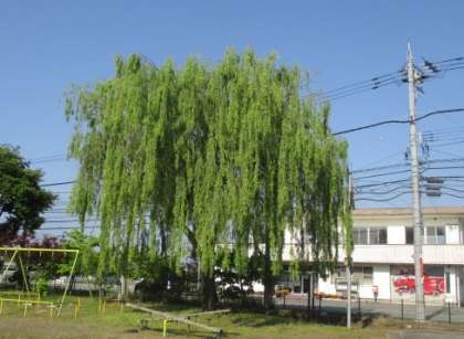 グラウンドの柳の木に青々とした葉が茂ってきました。