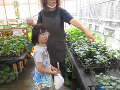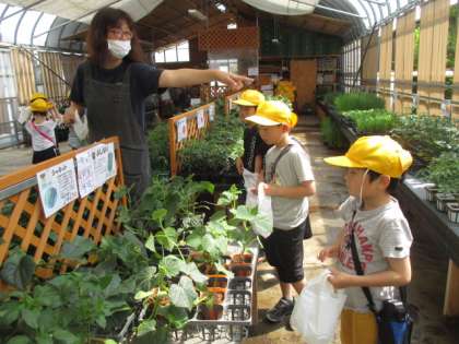 酒井農園さんへ野菜の苗を買いに行きました。野菜の種類がたくさんありましたが、子供たちは楽しそうに迷いながら、自分が育てる苗を慎重に選んでいました。