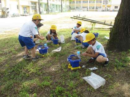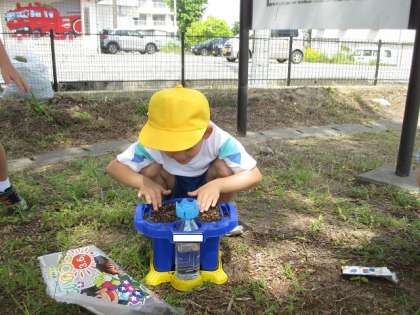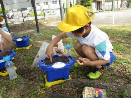 鉢に土を入れてきれいに表面をならし、指で穴を開けて大事な種を埋めました。