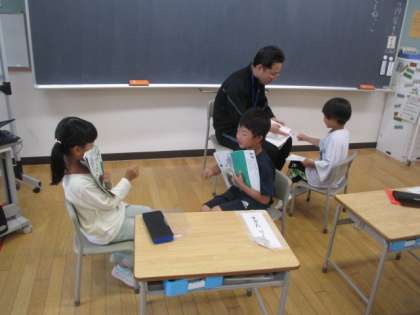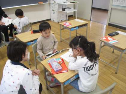 友達とペアになって「ねことねっこ」の音読をしています。促音に気をつけて、大きな声で音読していました。