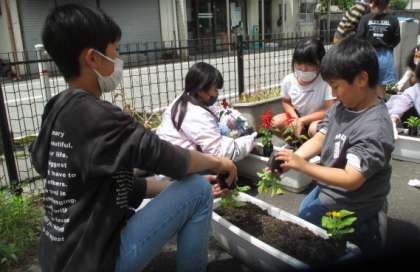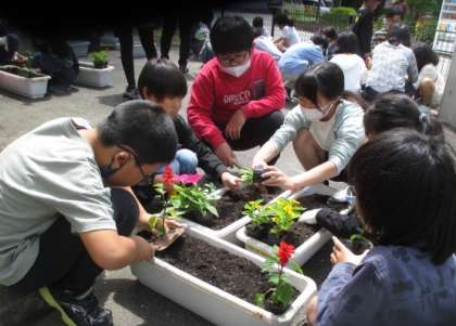 今日のひまわりタイムにファミリー班で花苗を植えました。