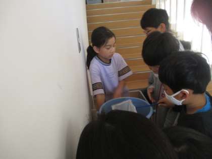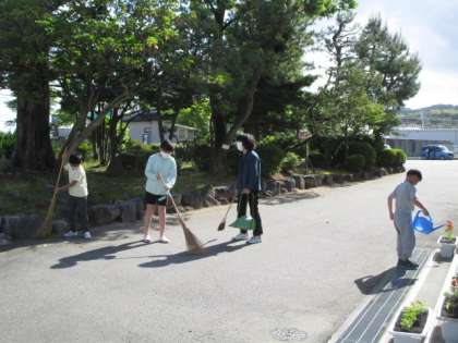 子供たちは、校庭の清掃をしたり、サンショウウオの世話をしたりしています。