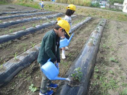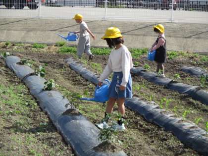 2年生は、学校横の畑で、自分の植えた野菜にたっぷり水をやっていました。