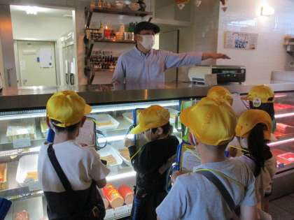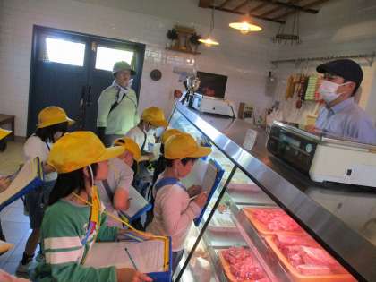 次は、近くの肉屋さんです。初めてお店に行った子も、何度か行ったことがある子も、わくわくしていました。人気の商品や、ウインナーの作り方なども、詳しく教えていただきました。たくさんの質問に答えていただき、大満足の2年生でした。