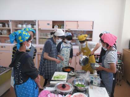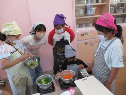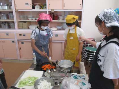 材料を切ったらゆでる作業と炒める作業に入ります。みんなで協力して手際よく調理しています。