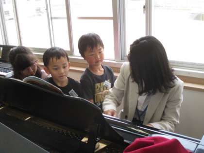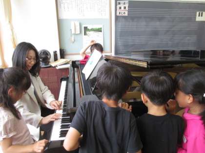 音楽専科の先生がピアノを弾くとハンマーが動く仕組みに、歓声をあげながら見入っています。