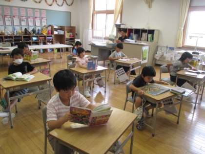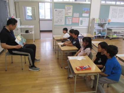 掃除の後は、読書タイムです。1年生は、担任の先生による読み聞かせをしています。2年生は、それぞれ選んだ本を読んでいます。