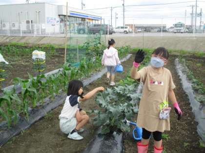 2年生の野菜畑では、野菜がぐんぐん成長しています。ブロッコリーの葉に青虫を発見した子供たちは、自分の大切な野菜に虫がついていないかチェックしています。