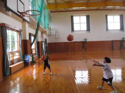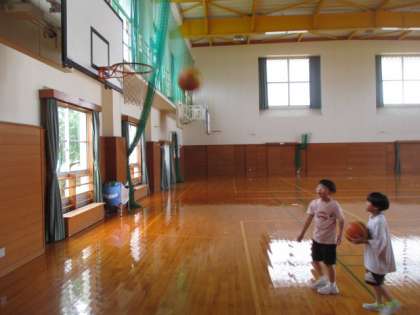 体育館では、1・2年生がシュート練習をしています。
