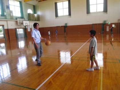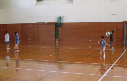 体育館では、ソフトバレーボールやバスケットボールをしています。