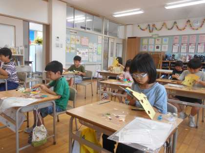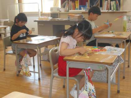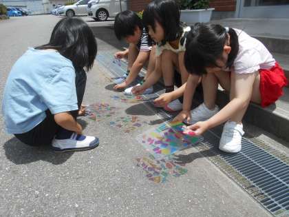 セロハンを使ったうちわ作りに取り組みました。制作途中ですが、外に出て光を通すと、地面に色とりどりの絵がうつっていました。子供たちは、その様子を見て大喜び。できあがりが楽しみです。
