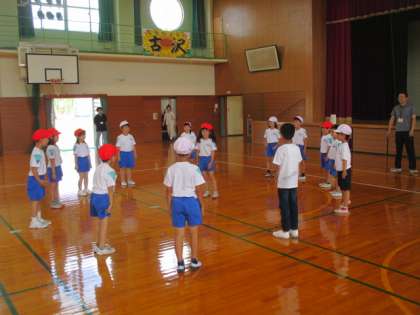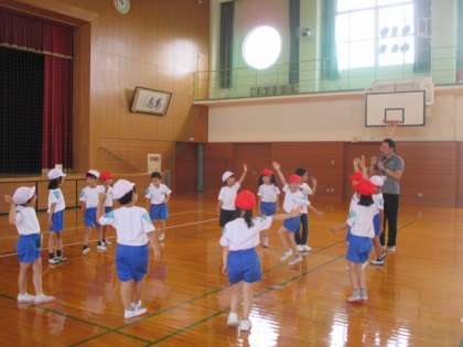 1・2年生みんなで「震源地を探せ」ゲームをしていました。友達の動きを上手にまねしていました。
