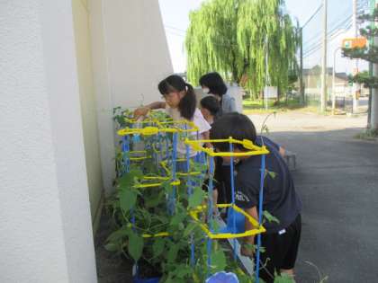 「花が咲いたよ」という明るい声に誘われて周りの子供たちもアサガオの花を見つめていました。まだ蕾のままの子供たちは、「明日は咲くかな」と待ち遠しい気持ちでいっぱいです。まだまだ、水やりもがんばっています!