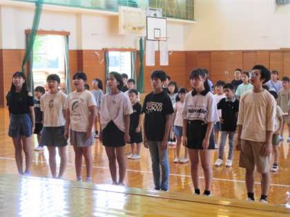 校歌斉唱の次は、児童会スローガンをみんなで言いました。