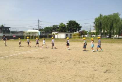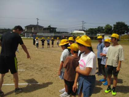 子供たちがグラウンドに出て、「古沢」と書かれた白線にスタンバイします。