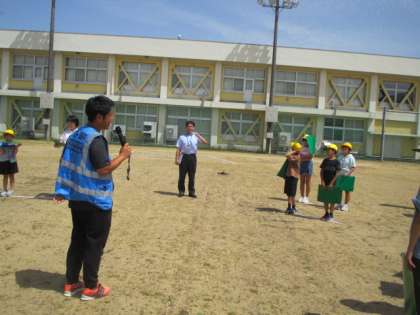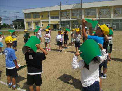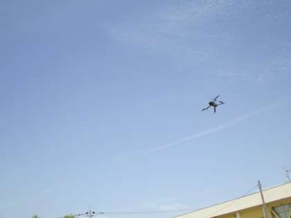 説明を聞いた後、いよいよドローンが飛び立ち、合図と共に緑色の画用紙を掲げます。