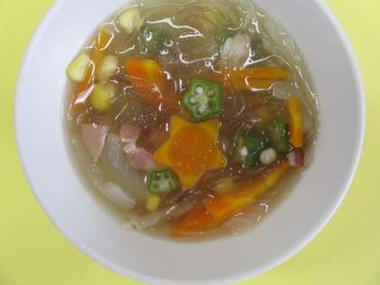 古沢小学校の「天の川スープ」は、天の川に見立てた春雨の間から出てきた人参も星の形になっていました。