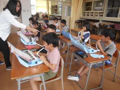 2年生は、音楽で「かえるのがっしょう」を練習しました鍵盤ハーモニカでおいかけっこを楽しむ2年生でした。