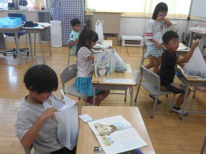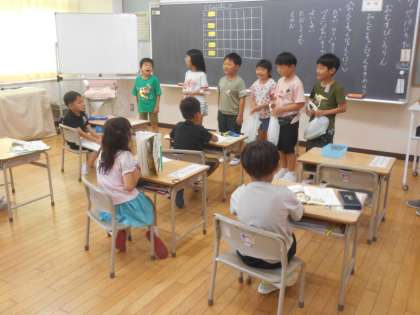 今日は、1年生に野菜のおすそ分けをしました。「家に帰って食べる。」とうれしそうに言う1年生を見て、2年生もうれしそうでした。