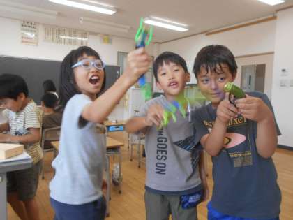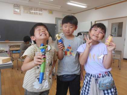 大きく育ったオクラや虫に食べられたトウモロコシを野菜星人にしました。