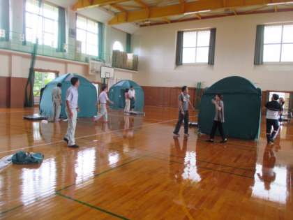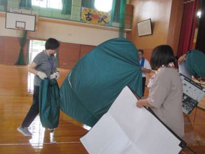 全員で協力して、体育館にワンタッチパーテーションを7基設置しました。