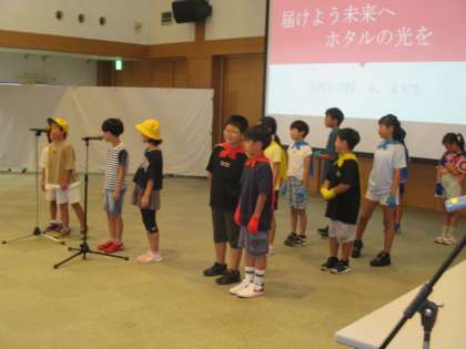3・4年生は、「悠久の森2023〜森で過ごそう〜」の屋内ステージで、『届けよう未来へホタルの光を』を発表しました。リハーサル中もたくさんのお客さんの前で緊張していた子供たちでしたが、本番では、総合的な学習の時間で学んだホタルの光り方や光る意味、この小さな光を未来へつなぐために何をしていけばよいのかについてしっかりと伝えました。保護者の方や地域の方も応援に来て、子供たちの発表を温かく見守ってくださいました。