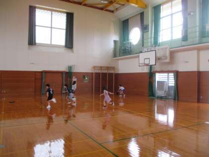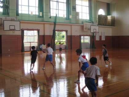大休憩の体育館では、バスケットボールやフリスビードッジを楽しむ子供たちの姿が見られました。