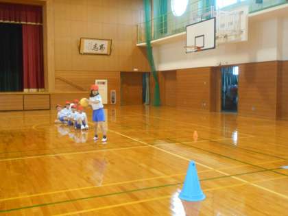 体育科で、「まとあてゲーム」をしています。子供たちは、まとをよく見る、前足を上げるなど、ポイントに気を付けて投げています。チーム戦は、とても盛り上がりまし♪♪