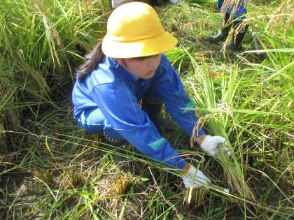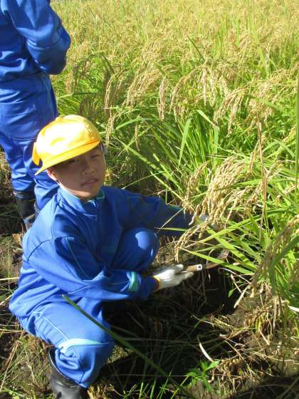 5年生は初めての稲刈りで大変そうですが、楽しくやってます!
