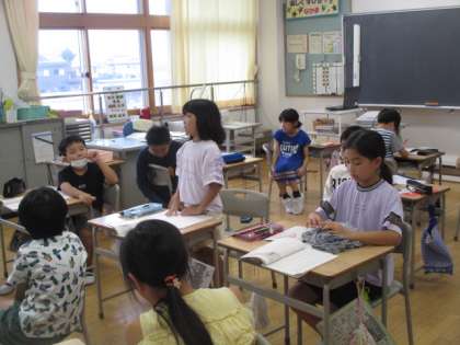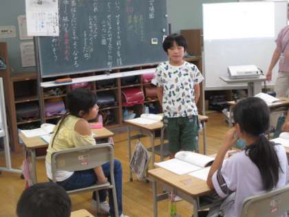 9月28日(木)3年生 国語 公開日 2023/09/28 更新日 2023/09/28 最新の出来事 「ちいちゃんのかげおくり」の作者 あまん きみこさんは、何を伝えたかったのでしょう。じっくり考えて伝え合っています。